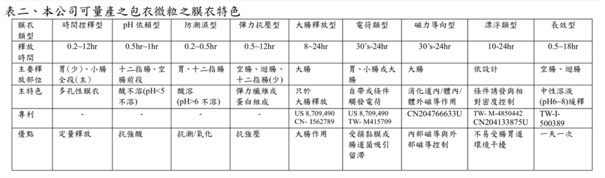 本公司所使用之各式膜衣,都是以可食用原料加工形成,各自有其專利: